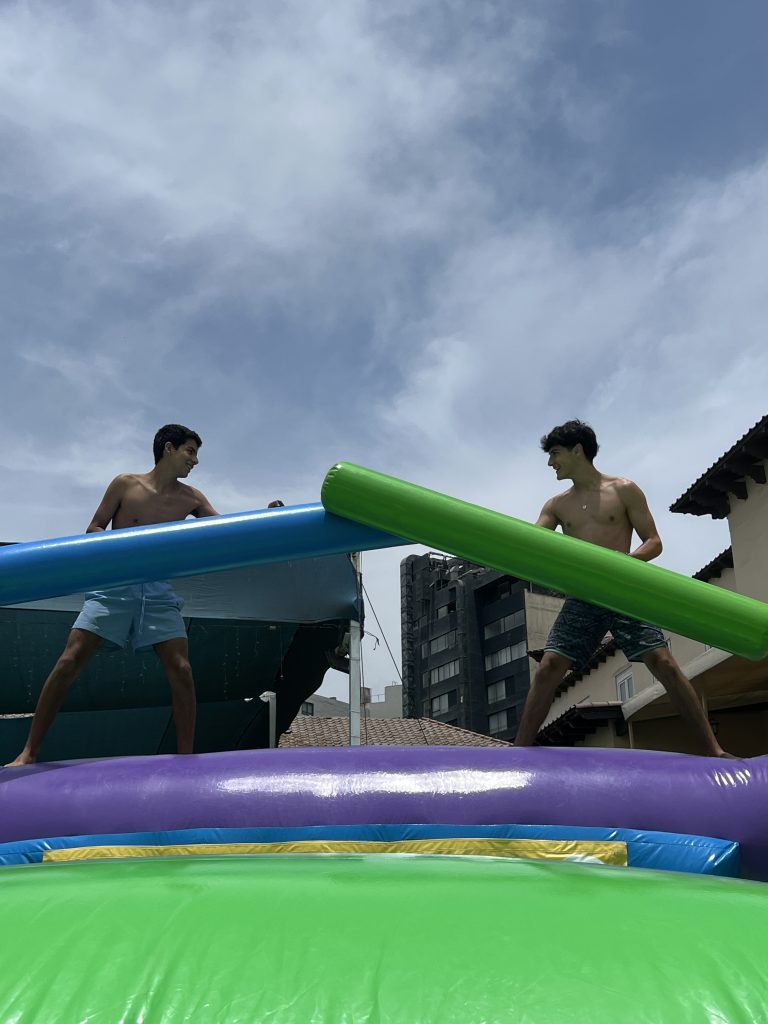 Los juegos inflables son de aire, comúnmente de telas sintéticas, con diferente modelo o forma: castillos, laberintos, series de obstáculos, viviendas, toboganes, entre otras, diseñadas para permitir que los usuarios reboten, se deslicen o suban en ellos, etc.